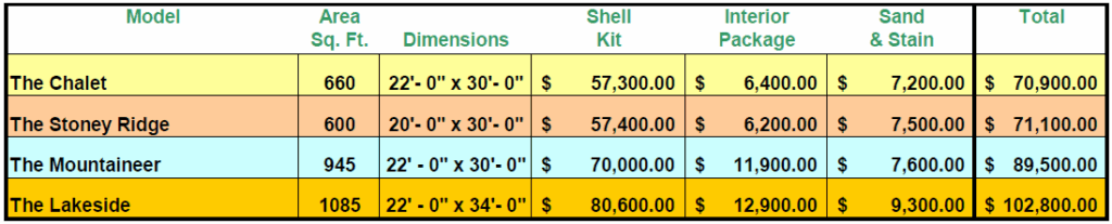 Upgrades: Pre-painted steel roofing, rustic cedar rails, rustic half-log stair system, screened-in porches, screened-in sunrooms, and cedar decking are available upgrades to any cottage kit